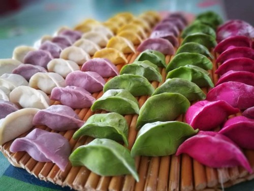 传授五彩饺子做法,绿色的用菠菜汁白色:即普通的白面。黑色:加入黑米粉或黑芝麻面。巧克力色:加入荞麦面。淡黄色:加入玉米面。橙色:加入胡萝卜汁。紫色:加入紫甘蓝汁。黄色:加入鸡蛋黄液。青白色:加入鸡蛋青液。珊瑚色:加入西红柿汁。墨玉色:加入茄子汁。红色:加入草莓汁或者火龙果汁。浅棕色:加入芋头汁。水晶色:加入冬瓜汁等等。